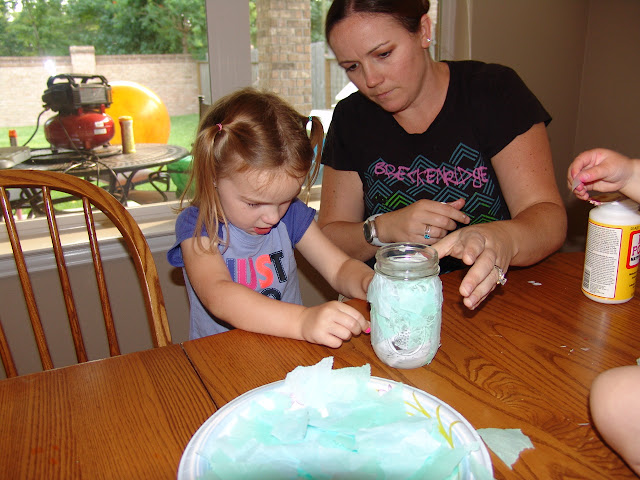 We decided that our plan of action was to have the "Paci Fairy" come to our house to bring them something special in place of the pacifiers. I really wanted to keep the pacis, I know, kinda weird but for some reason I am really sentimental about them. So I grabbed a mason jar and let them decorate it with tissue paper, glitter, and Mod Podge. They had fun, although Emmery was pretty resistant at first because she knew what the jar was for.